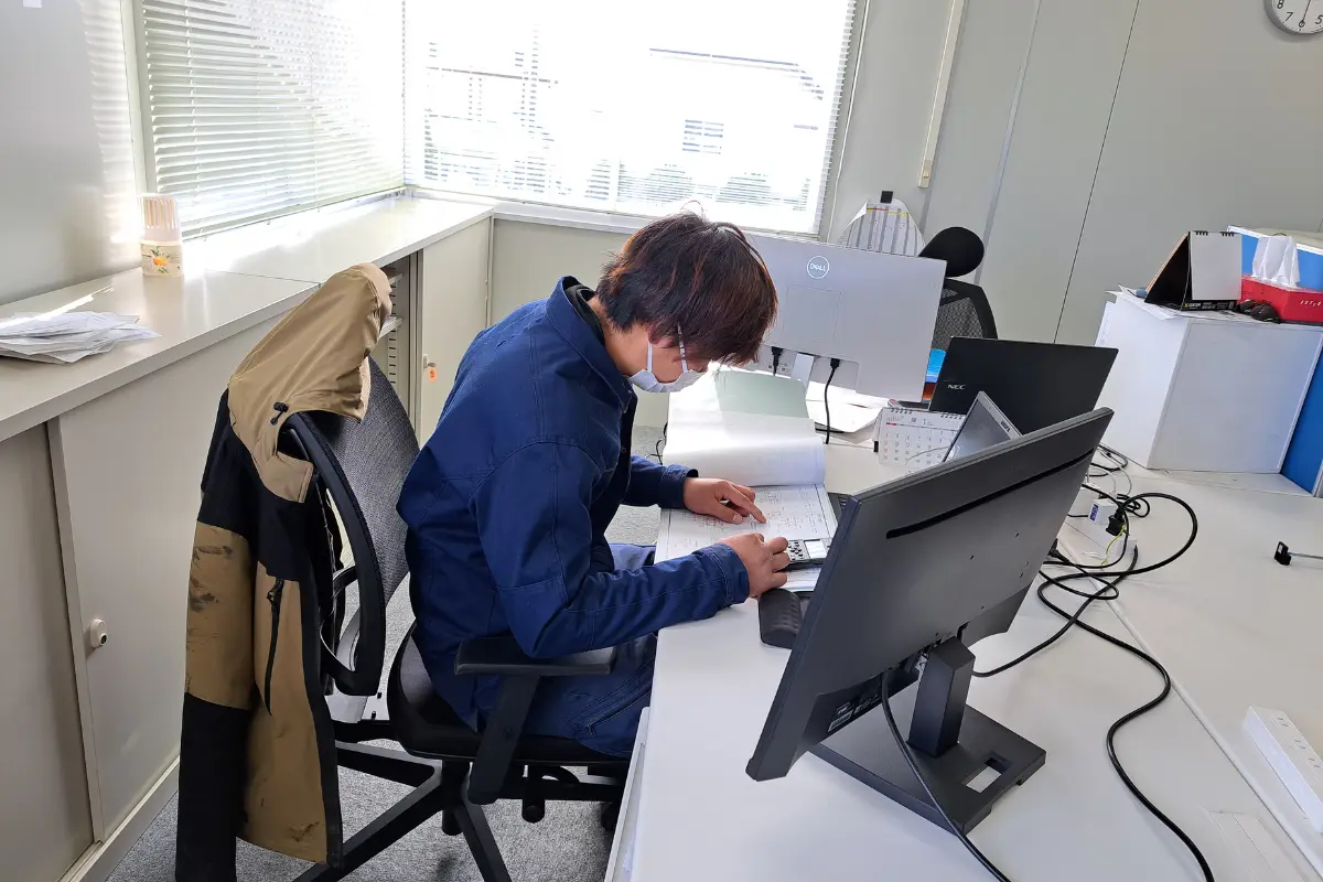 現場は2〜3名体制で管理を行い、入社後は先輩のサポートからスタートし、OJTを通じて業務を覚えていきます。